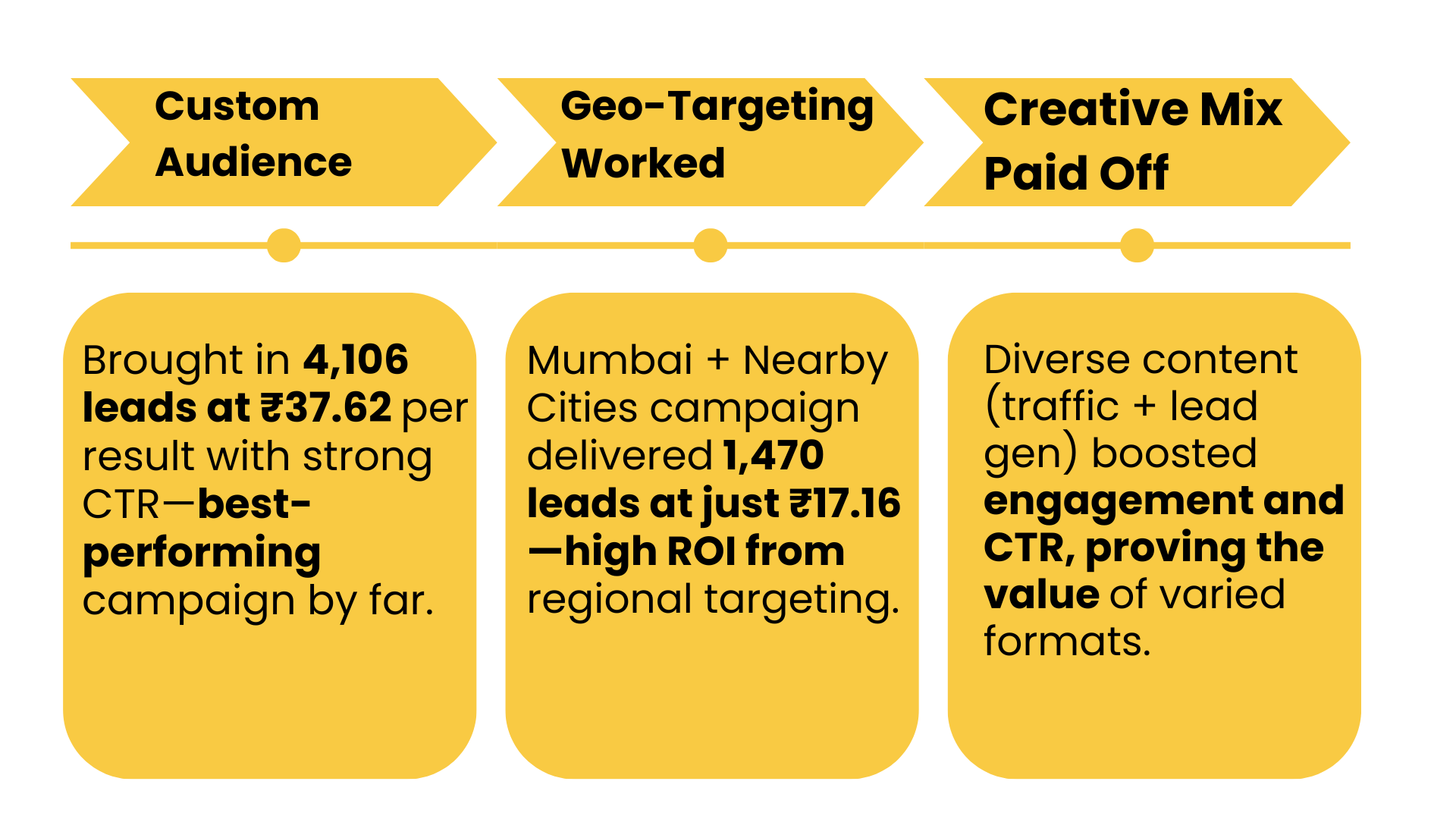 Website Reg‑Custom Audience generated 4,106 leads at ₹37.63/lead, accounting for 69% of total lead volume and demonstrating strong audience resonance.